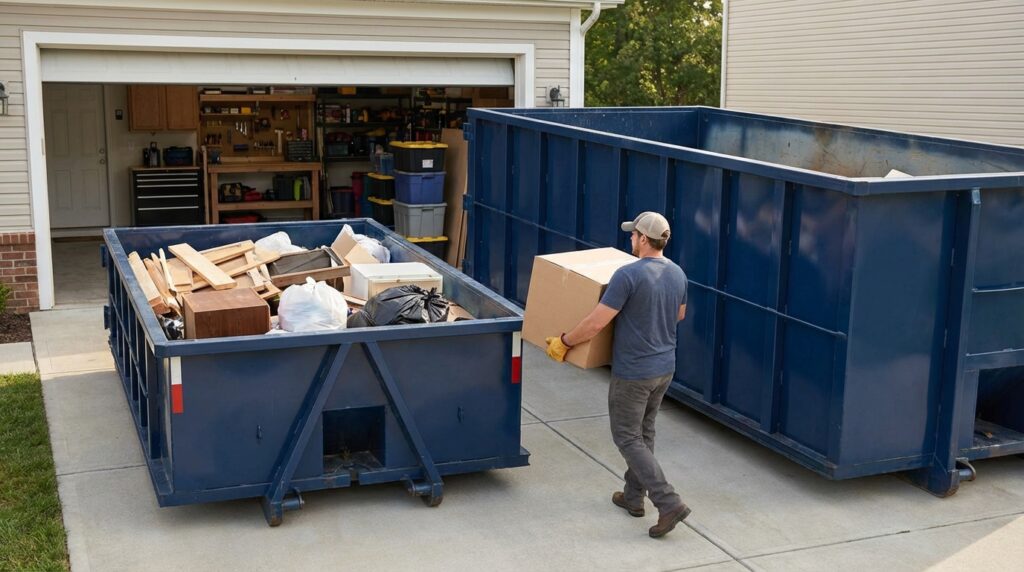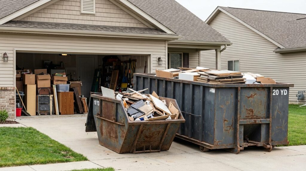 Most residential garage cleanouts require a 10-yard or 20-yard dumpster, depending on garage size and clutter levels. A 10-yard container handles light to moderate decluttering in single-car garages, while 20-yard dumpsters accommodate full two-car garage cleanouts or projects involving renovation debris and larger furniture items.